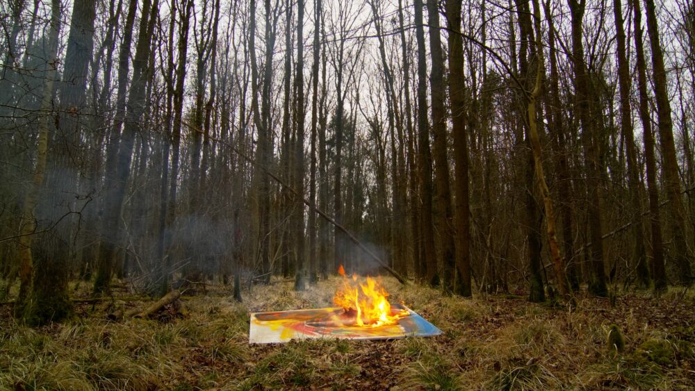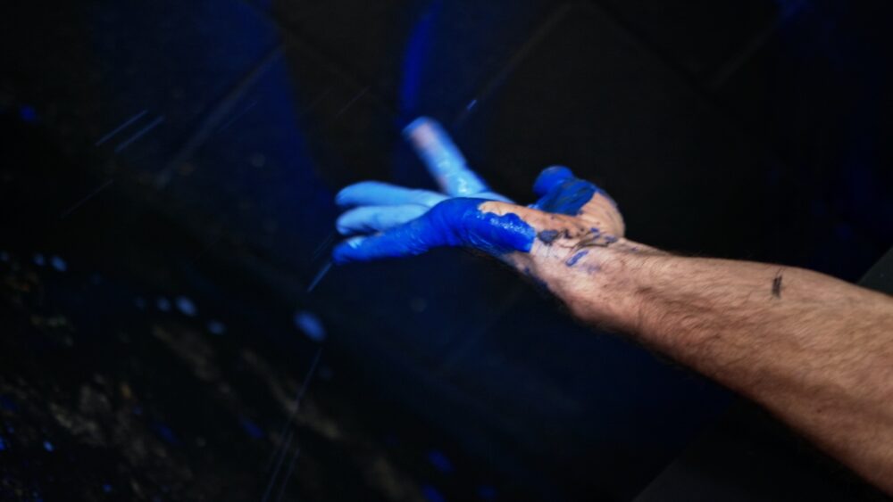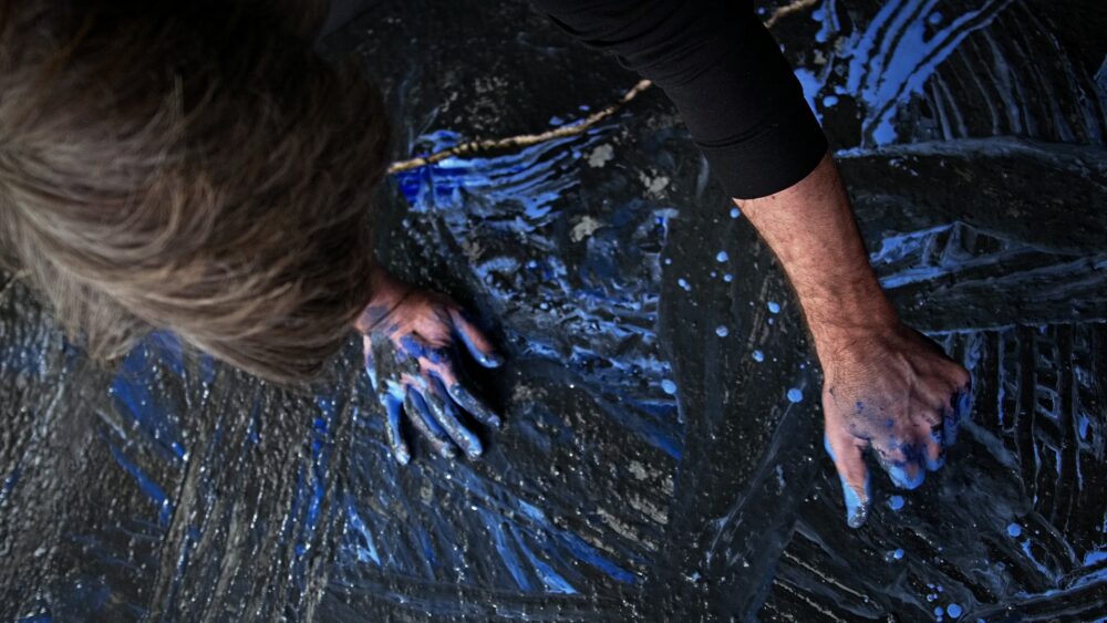 The moving image piece Black and Blue features a sequence of performances and is a meditation piece upon Creation and destruction and self isolation.